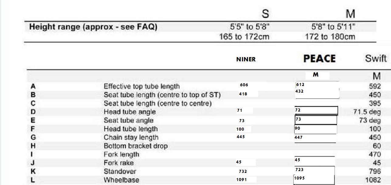 Таблица геометрий Gt Peace,Singular,Niner MCR размера М