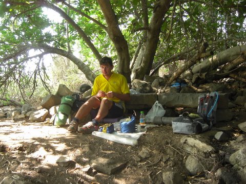 Спустились по маршуруту средней сложности. Я даже покатался на бермах и трамплинах. У Вити звенела кастрюля на каждой кочке и он съехал без выпендрежа. С большой стоянки вышли на джиповку "Цир 5" и по булыжникам, "живым камням" и щебенке стали спускаться к Неве Атибу. Один раз завалились. К Неве Атибу вышли около 12.30. Нам не хватило времени и сил доехать до обеда. Без сил легли на асфальт прямо у въезда в село и отключились на полчаса. Немного отдохнув доковыляли до Мадждиль Шамса, сели в первой же домашней забегаловке. Первым делом выпили 1.5 литра лимонада, а потом ели домашние лабане, хумус, помидоры, огурцы, соль. Мясо в этот день не готовили так как было мало туристов. На дорогу нам выдали по паре яблок и манадарин. У меня в легкоходных сумках места не было, поэтому все загрузили к Вите. Сразу на выезде из Шамса упали в тень в сосновом лесу и соснули часок. В 15.30 пришлось встать из пыльных иголок и продолжить поход. На удивление вниз катилось легко и приятно. Вокруг друзские крестьяне собирали яблоки. Тут и там усатые мужчины на маленьких тракторах свозили ящики с урожаем на яблочную фабрику. Через лес Одем поднялись к горке Одем. В Букате купили ужин и стали на ночевку в винограднике рядом с сирийской границей